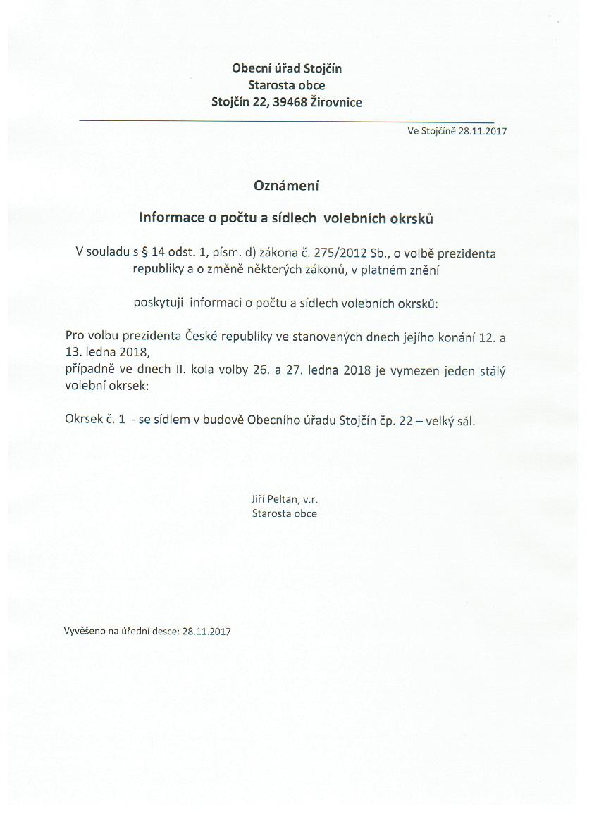 Informace o počtu a sídlech okrsků volba prezidenta